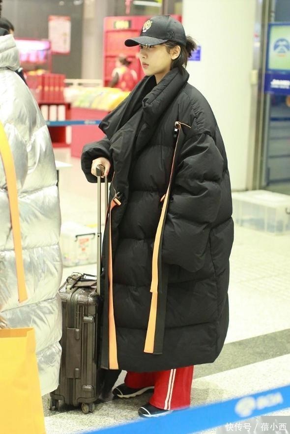 这件黑色长款羽绒服是杨紫这一身造型的核心,过膝至踝的长度非常遮肉显瘦,搭配了宽松的红色运动裤,用“上宽下宽”的方式消解了厚重感。更妙的是衣服侧边的橘色飘带,这条亮色装饰像“视觉分割线”,既打破了纯黑的沉闷,又让原本单调的羽绒服多了一些时尚感,走动时飘带随步伐摆动,瞬间让厚重单品轻盈起来。