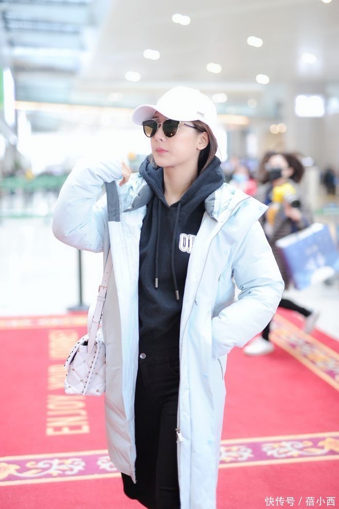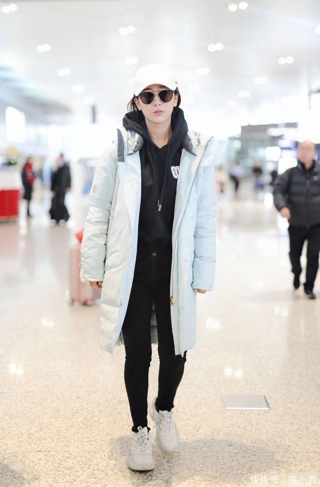 内搭选了基础款黑色连帽卫衣,把羽绒服敞开穿,看起来更有层次感,这种叠穿搭配的配色非常妙,卫衣的深色调刚好压得住浅蓝的柔和,下装是百搭的黑色紧身裤,顺着腿部线条延伸到白色厚底鞋,松紧之间把过膝长羽绒服的压个子风险彻底化解,再配上白色的棒球帽和黑色墨镜,松弛且时髦极了。